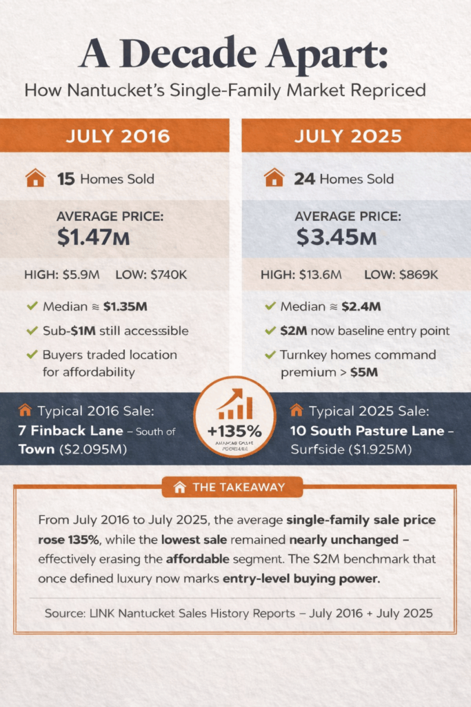 As Fisher approaches its 10th anniversary in 2026, Nantucket’s market has undergone a structural shift that now feels permanent—one that continues to redefine what buyers can reasonably expect at the “entry level.” Anyone living or working on the island has watched this evolution firsthand: steady price appreciation, new record-setting sales, and a diminishing supply of what once was a starting point. A decade ago, sub-$1M homes accounted for roughly 6% of annual sales. Today, that segment has disappeared entirely, and as we close out 2025, even the sub-$2M market is becoming a distant memory. Only two single-family homes are currently listed under $2M, and both require significant compromise.